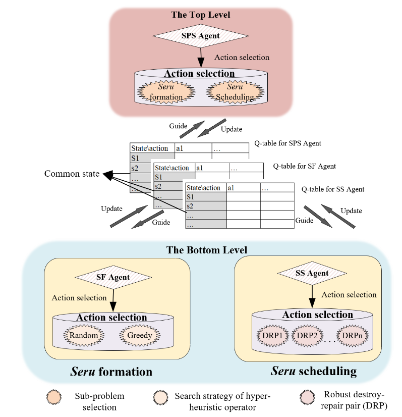 团队提出的基于双层鲁棒Q-learning的协同进化算法框架。该框架采用分而治之的方法,将复杂的赛汝生产调度问题分解为两个层次:顶层负责子问题的选择,底层负责子问题的优化。顶层具备远见能力,能够选择对优化最坏情况下系统性能具有潜力的子问题;底层利用迭代过程中获取的知识快速提升解的质量。顶层与底层的协同作用,使得所提出的鲁棒Q学习模型能够更加高效地搜索优质生产调度方案。