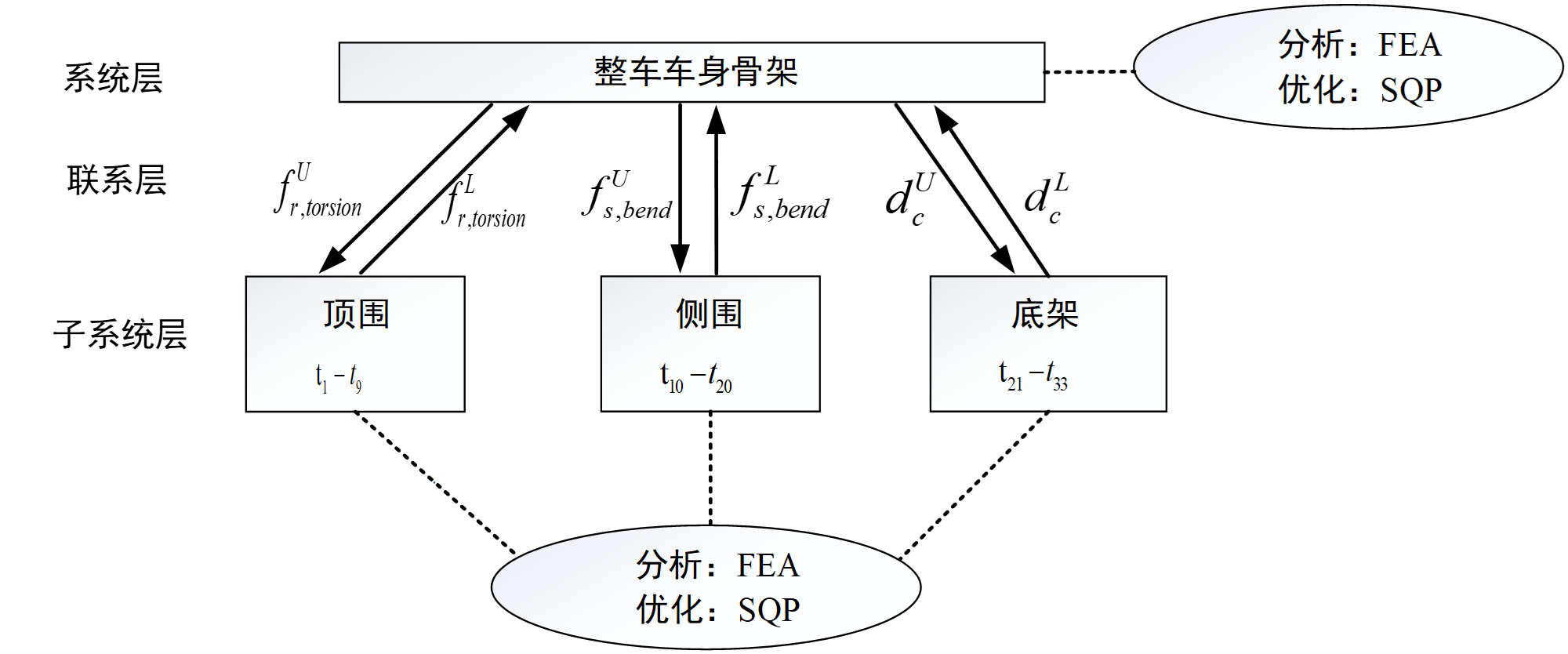 提出基于目标分流的车身结构轻量化方法。该方法根据车身结构的特点,构建纯电动汽车车身骨架轻量化协同机制;进一步将纯电动汽车车身骨架结构轻量化问题拆解成系统层优化问题和子系统层优化问题,上下层系统交替求解,直至问题收敛;能够在满足纯电动汽车车身骨架结构性能要求的同时,实现有效地减重,具有很强的工程实用性。