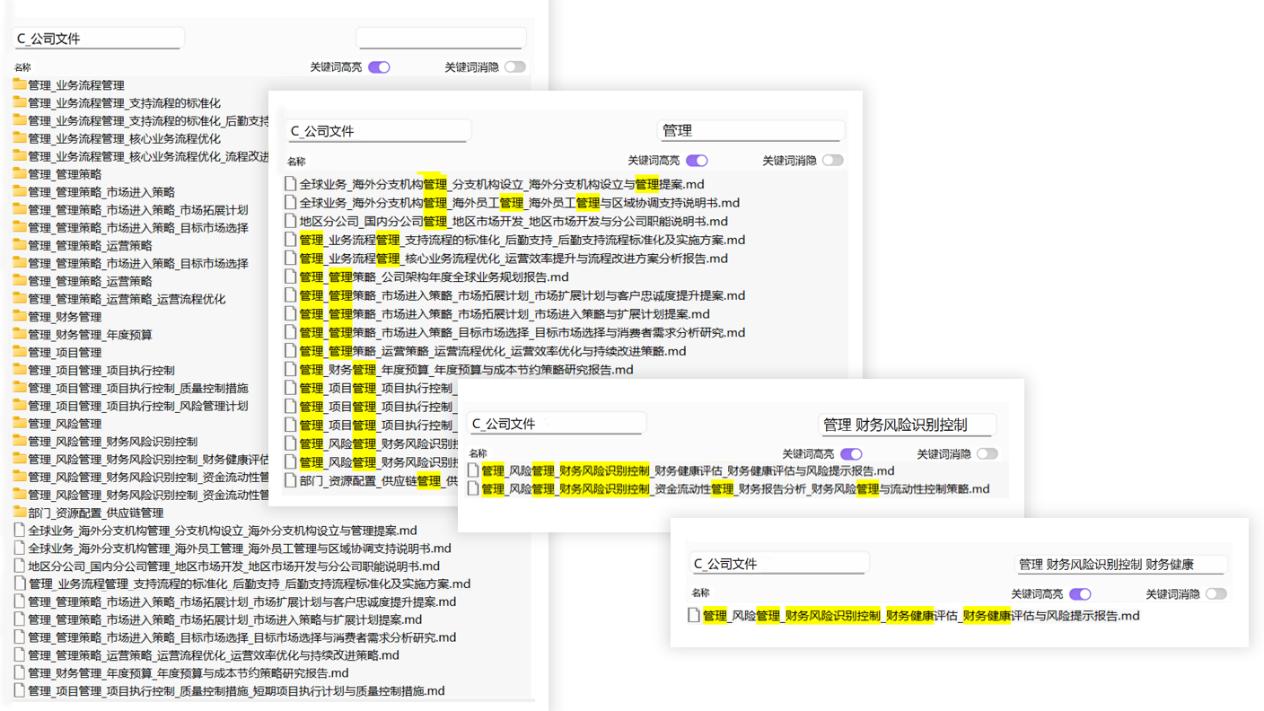 本成果提出了一种基于通用设备的文件存储和检索方法,用户可以用检索的方式将文件按照不同分类逻辑,通过输入属性词的方式进行动态的展示,形成一种全新的文件管理模式。用户既可以按照已有的属性词对文件进行命名,又可以创建新的属性词,进而创建新的分类规则。在文件检索时,使用一个或多个关键词对同级及跨级的存储文件名称中的属性词进行检索,进而筛选出所需文件。文件检索可以不受存储文件所处层级的限制,使得用户快速定位所要检索的文件。本专利使用同级及跨级的文件检索,与检索条件相同的属性词的消隐形式将文件的管理形成了一种全新的文件动态分类管理的形式。如图所示: