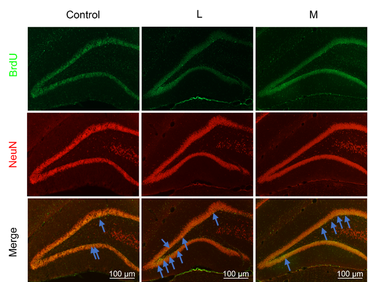 图2 化合物低,中(L,M)浓度对大鼠海马神经发生的影响(BrdU是新生神经细胞标记物,NeuN是神经元标记物,Merge是两种标记物共定位)