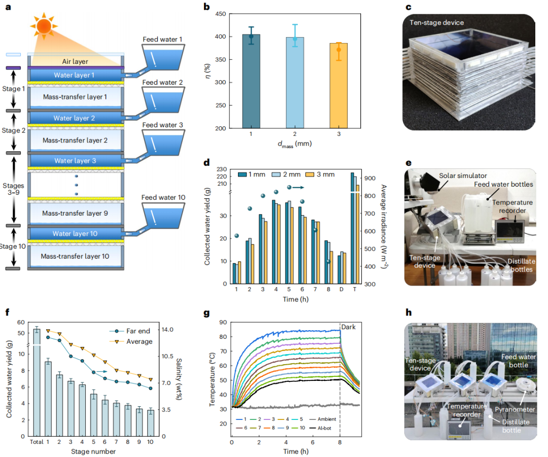 技术优势:通过数据显示,单级蒸馏装置在常规3.5 wt%盐水环境下实现了60.6 %的太阳能到水的转化效率,并在21 wt%浓盐水环境下以47.4 %的效率可持续地蒸馏。具有10级水层回热结构的装置在常规3.5 wt%盐水环境下取得了354 %的高效率,并在每一级水层中都成功实现了抗盐功能。