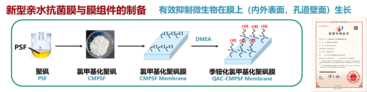 目前主流的抗菌膜制备方法是在基膜表面接枝抗菌物质,常用的抗菌材料包括氧化石墨烯、碳纳米管、抗菌聚合物、金属离子等,但这些材料普遍存在着接枝方式复杂,且对环境有危害的缺陷。相比而言,季铵盐类抗菌剂具有抗菌效果好,环境友好等特点,目前水溶性的小分子或高分子季铵盐抗菌剂已经广泛应用于水处理、食品、医疗卫生和包装材料等领域。然而,将季铵化合物直接接枝到膜表面所制备的抗菌膜仍存在制备流程复杂,成本较高等问题,这也使得目前开发的大部分季铵盐功能膜无法大规模应用于实际水处理系统。因此,为解决以上问题,开发新型亲水抗菌功膜的制备方法是目前业内所亟需的。