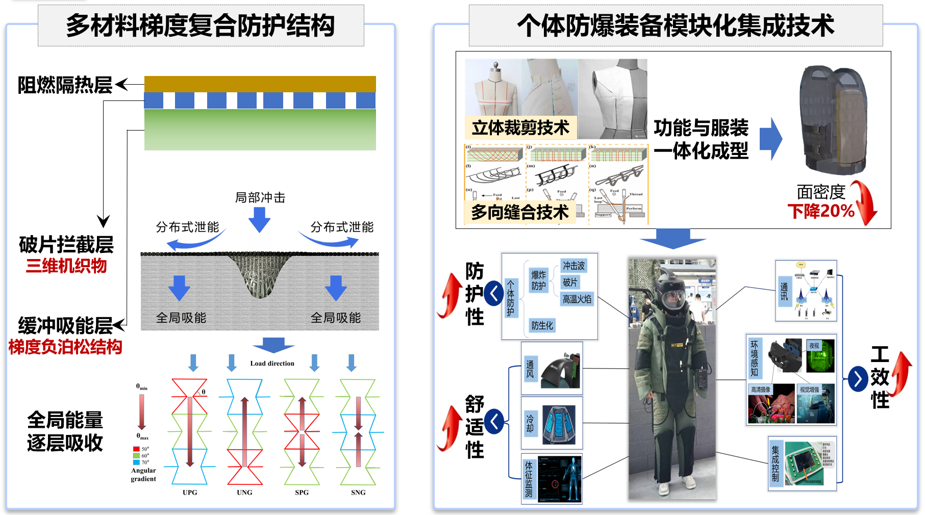 本成果从一线排雷作业需求和突破国际技术壁垒出发,结合爆炸载荷时序防护和耦合防护特性,研制了面向爆炸场景的冲击波、破片一体化防护结构,研究针对冲击波的高效吸能多孔材料,获得关键设计策略和参数,实现防爆削波能力提升40%;基于高性能机织物及其复合材料,借助粒子改性及梯度复合方法,实现破片抵御,综合抗弹性能提升25%;通过波阻抗匹配设计及梯度阻抗削波技术,研发多材料梯度复合防护结构,通过分布式泄能和全局式吸能实现爆炸多源毁伤一体化防护,结构面密度减轻20%。基于抗多荷载耦合损伤分级防护策略开展综合设计,关键部位针对性增强,次要部位降级防护,减重赋能使作业人员行动速度上升80%,满足工效性和轻量化需求。