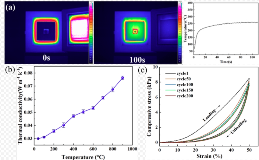 图3.纤维海绵(a)在1000℃时的隔热效果;(b)高温热导率和(c)50%应变的压缩回复性能