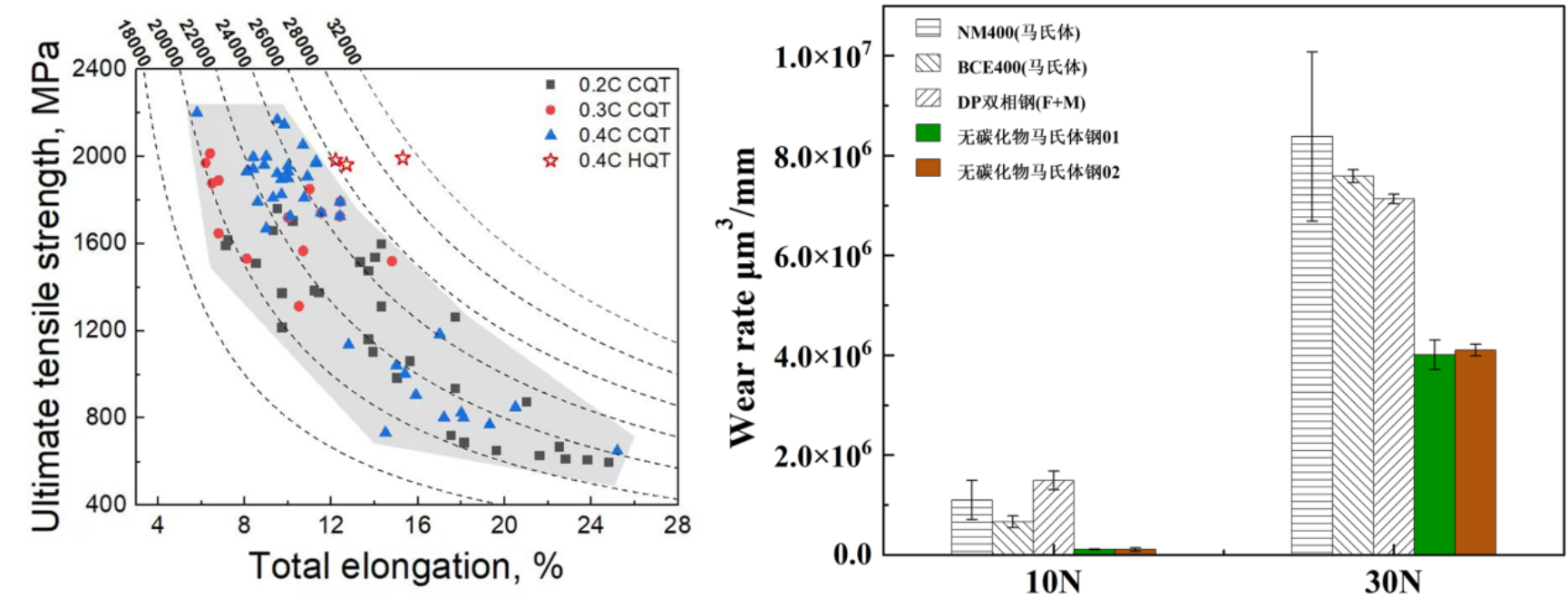 所开发的无碳化物Fe-C马氏体及其新型钢,材料成本降低,强塑性匹配大幅提升,耐磨性能较NM400提高50%(图2)。