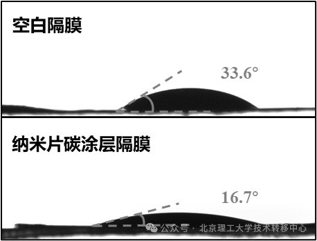 图3.该纳米片碳涂层隔膜与空白隔膜的接触角对比