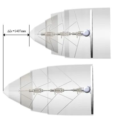 该变体头锥的机构主体为三级连杆机构,每一级连杆机构主体可看作曲柄滑块,可实现最大1400mm以上的轴向伸缩量。在头锥尾部由电机驱动轴系带动前端三级连杆机构整体运动,实现头锥弯曲变形,伸展弯曲比例可达3.5。各级连杆机构上分别安装有气动锁定装置,用以实现头锥高负载下的变体锁定。头锥伸展变形为三级,单独驱动,各级之间可均匀变形也可非均匀变形,又可以单级变形,头锥弯曲变形独立进行,不与其他部分相干,提供了多种气动外形选择,有利于适应较复杂的空天环境。