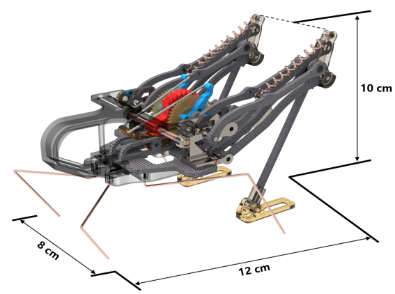 跳跃或飞翔等运动形式,可以获得远高于传统行走、爬行步态的运动灵活性,为使机器人具有小尺度、高集成、多模态的特点,本项目在国内首次提出“跃翔一体”的机器人设计理念,创新性将跳跃结构与固定翼飞行思路结合,集飞行模块、驱动模块与仿生弹跳腿于一体。研制的原理样机在微小尺度下实现了5倍体长的跳跃高度(0.5m)的同时,可在空中维持良好姿态、滑翔距离达到了50倍体长(5m)。