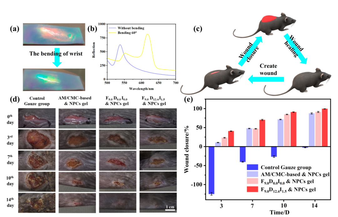 本成果实现了皮肤形变及伤口开裂的可视化预警,当皮肤伤口开裂逐渐增加至8.0 mm时,反射峰由625 nm蓝移至501 nm,结构色由红色变为黄色、黄绿色、绿色以及青色,鱼胶蛋白水凝胶具有良好的生物相容性和药物稳定释放功效,IBF释放量占水凝胶释放总量的5% ~ 7.5%,HEK293细胞在其中培育3天的存活率超过80%,具有优异的生物相容性,对控制水凝胶贴片的给药量和持续给药具有重要意义。