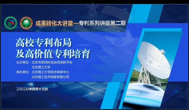 2020年4月13日上午,北理工“成果转化大讲堂”——专利系列讲座第二期成功举办。本次讲座继续采用线上直播形式开展,以“高校专利布局和高价值专利培育”为主题,邀请了原国家知识产权局专利局 “骨干人才”、现沃杰知产团队创始人杨杰博士主讲。来自校内外的近300位科技工作者参加了活动。