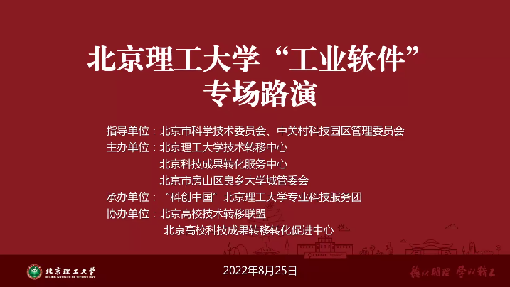 2022年8月25日下午,永利yl23411“工业软件”专场路演活动顺利举行。本次活动在北京市科委、中关村管委会的支持和指导下,由北理工技术转移中心、北京科技成果转化服务中心和北京市房山区良乡大学城管委会联合主办。路演采取线上线下相结合的方式,受到社会各界广泛关注。