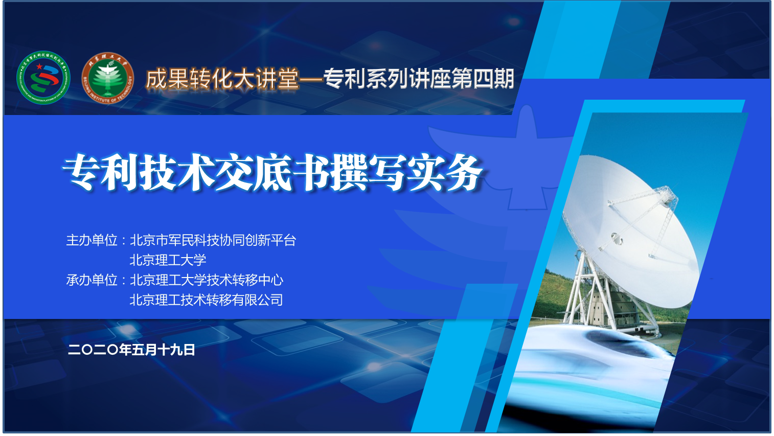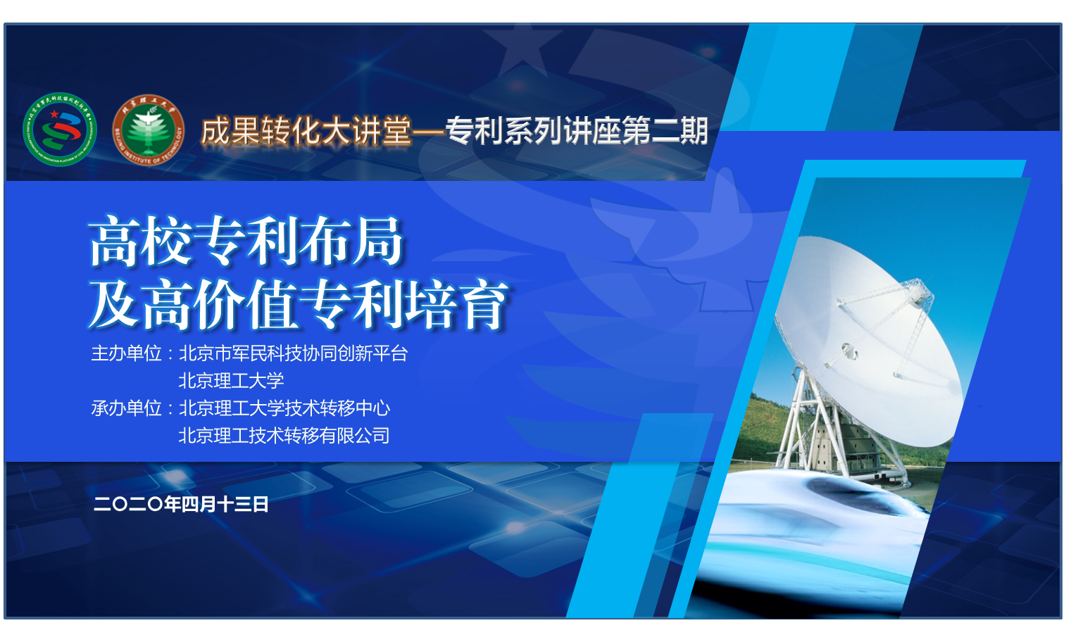 北理工成果转化大讲堂专利系列讲座第三期成功举行2020年4月28日上午,北理工“成果转化大讲堂”——专利系列讲座第三期成功举办。 -