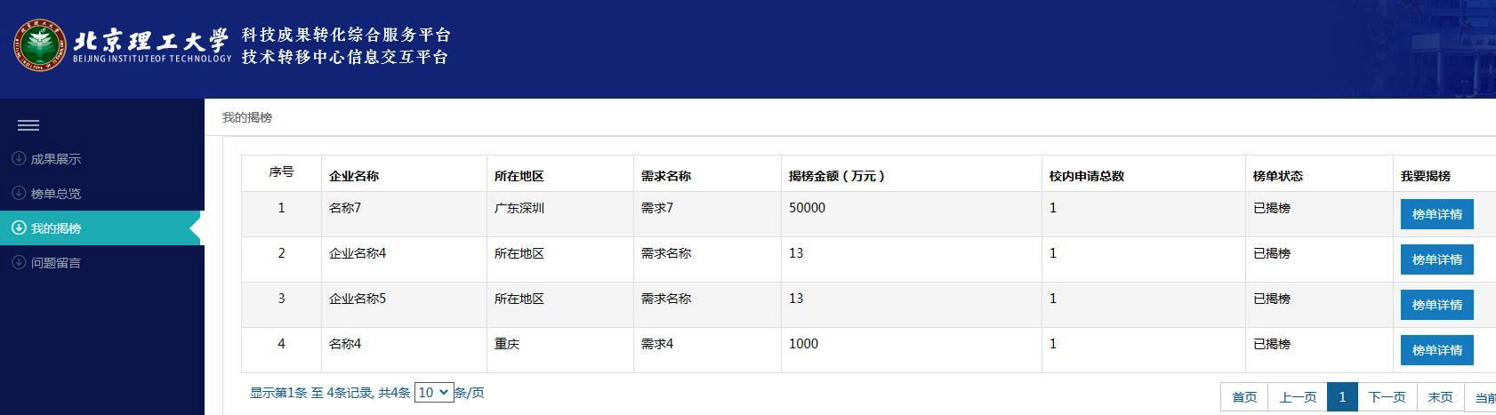 揭榜人与企业达成合作意向的,技术转移中心将榜单状态变更为“已揭榜”,同时进一步服务揭榜人完成科技成果转化工作流程。揭榜人可以在平台“我的揭榜”栏目下查询自己所有已完成揭榜的榜单信息。