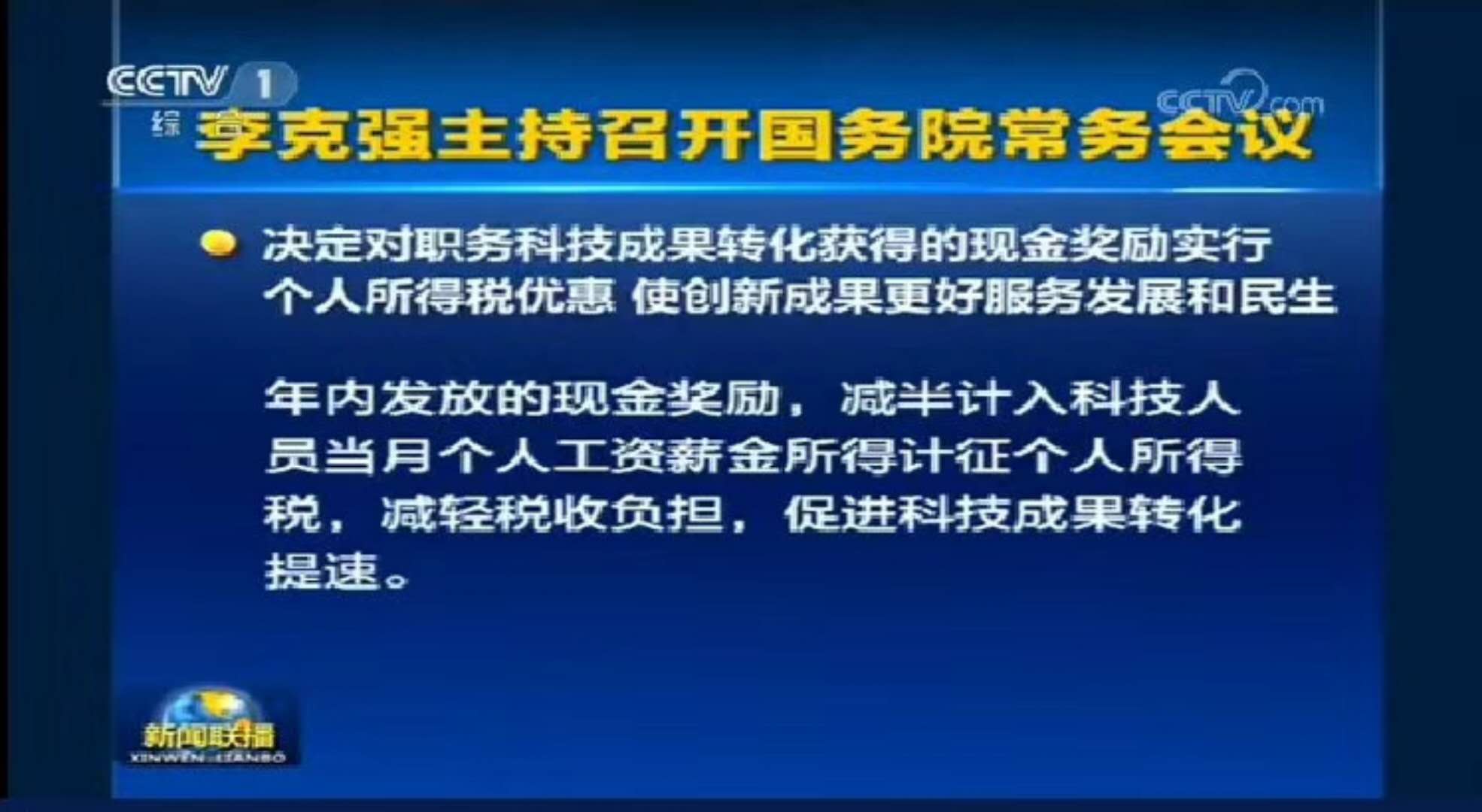 科技成果转化个人所得税政策关系到广大科研人员的切身利益,值得深度关注。根据2018年4月18日新闻联播报道,当天召开的国务院常务会议决定,在落实好科技人员股权奖励递延纳税优惠政策的同时,对因职务科技成果转化获得的现金奖励给予税收优惠。具体是:对依法批准设立的非营利性科研机构、高校等单位的科技人员,通过科研与技术开发所创造的专利技术、计算机软件著作权、生物医药新品种等职务创新成果,采取转让、许可方式进行成果转化的,在相关单位取得转化收入后三年内发放的现金奖励,减半计入科技人员当月个人工资薪金所得计征个人所得税,减轻税收负担,促进科技成果转化提速。