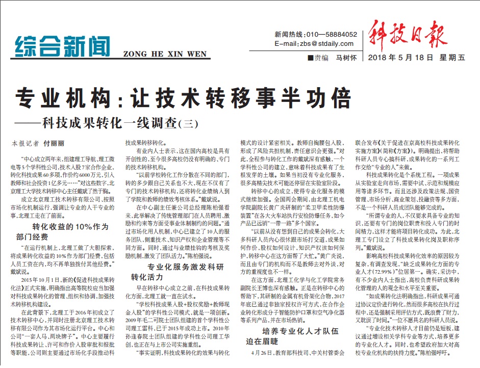 【转载】科技日报2018年对北理工科技成果转化工作系列报道